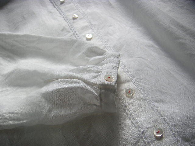 貝ボタンは赤い糸で縫い止めて